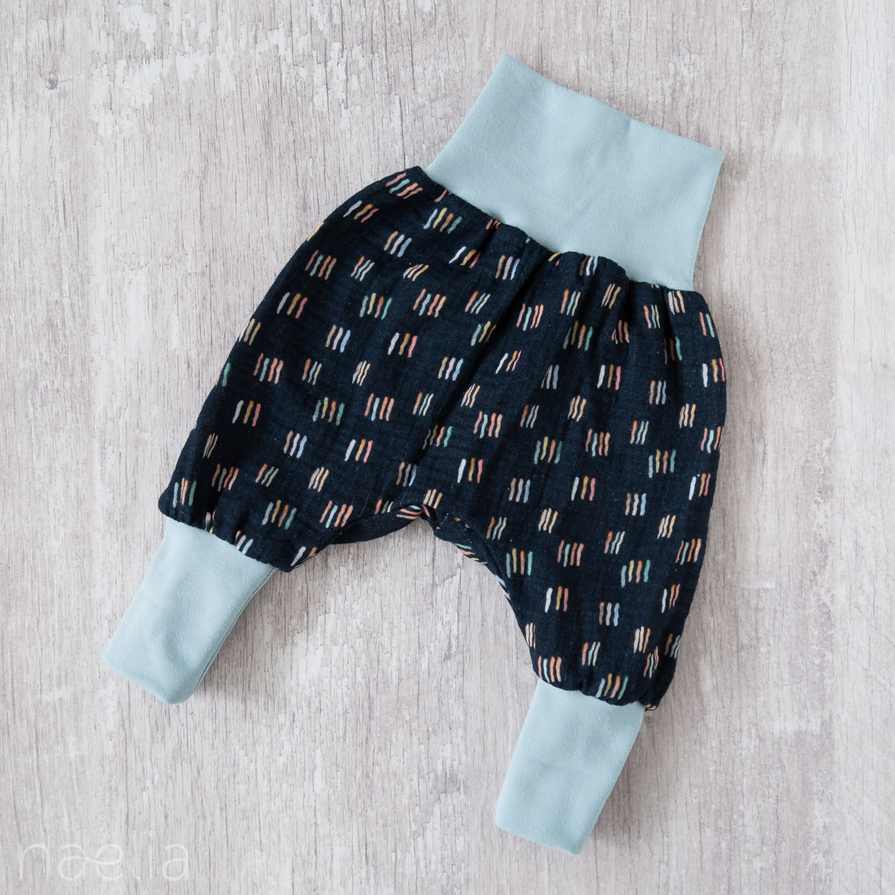 Die Pumphose bietet jede Menge Bewegungsfreiheit zum Strampeln und Toben. Sie hat ein extra breites Bauchbündchen, damit der Bauch schön warm gehalten wird und extra lange Bündchen, damit sie lange mit dem Baby mitwächst! Die Pumphose aus Musselin ist durch den dünnen luftigen Stoff besonders für die warmen Monate geeignet. Konfiguriere dir gerne deine eigene Pumphose. Du hast die Möglichkeit, dir selbst eine Bündchenfarbe auszusuchen – wenn du lieber möchtest, dass ich das mache, dann wähle im Menü Bündchenstoff einfach **Überrasche mich** aus.